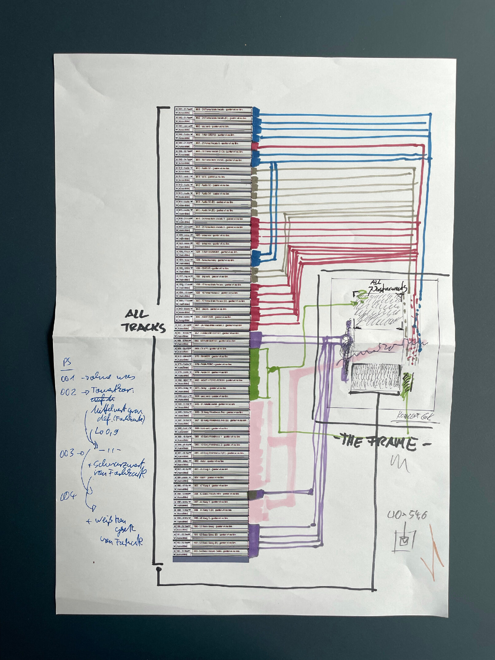 During the creation of the main work “The Frame,” numerous sketches, variations, drawing studies, and note-laden “fragments” emerged.