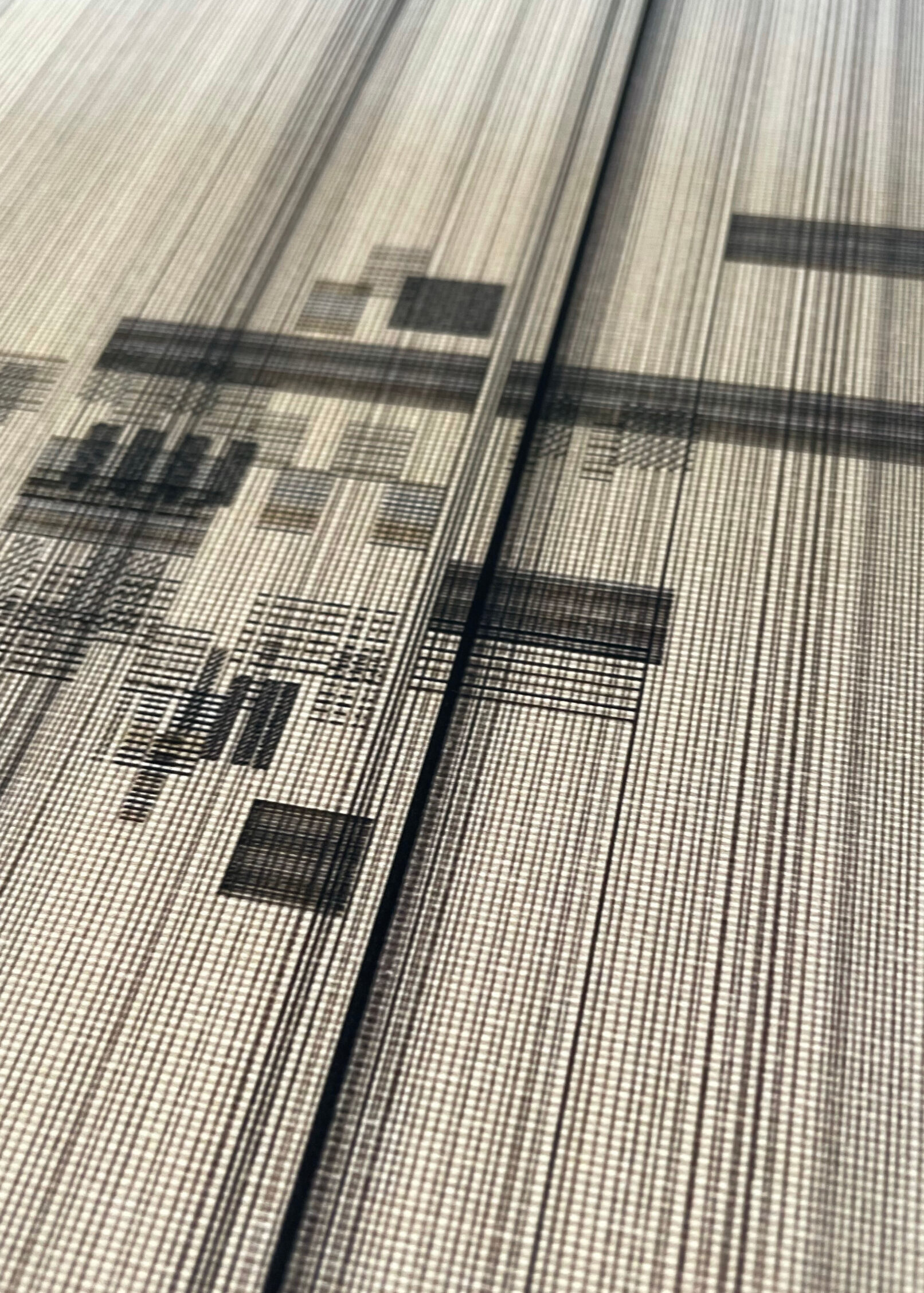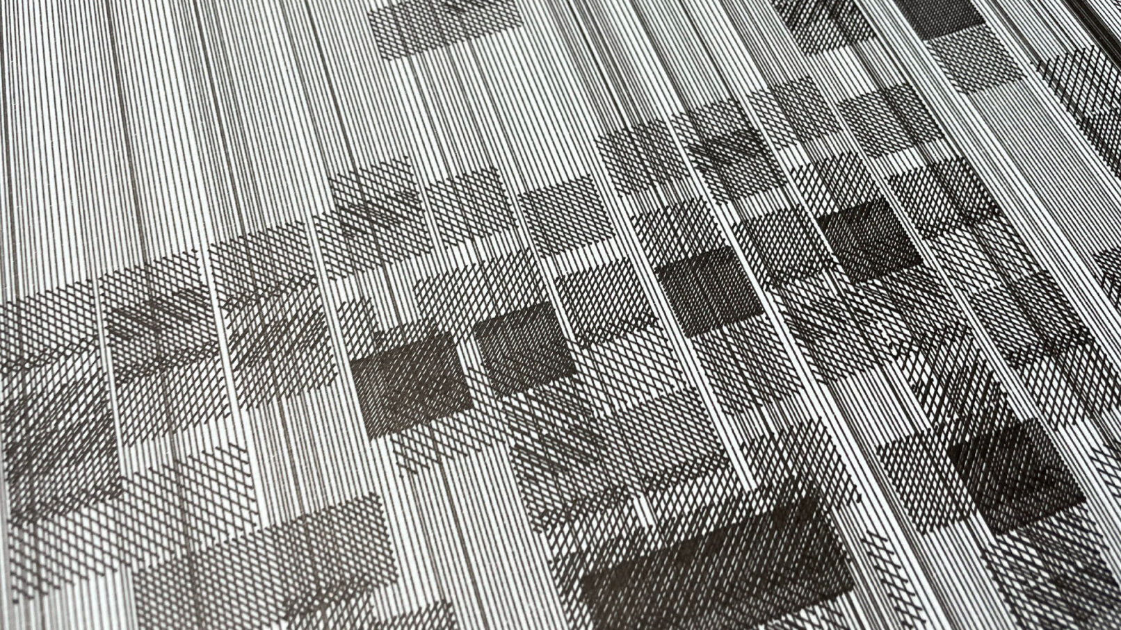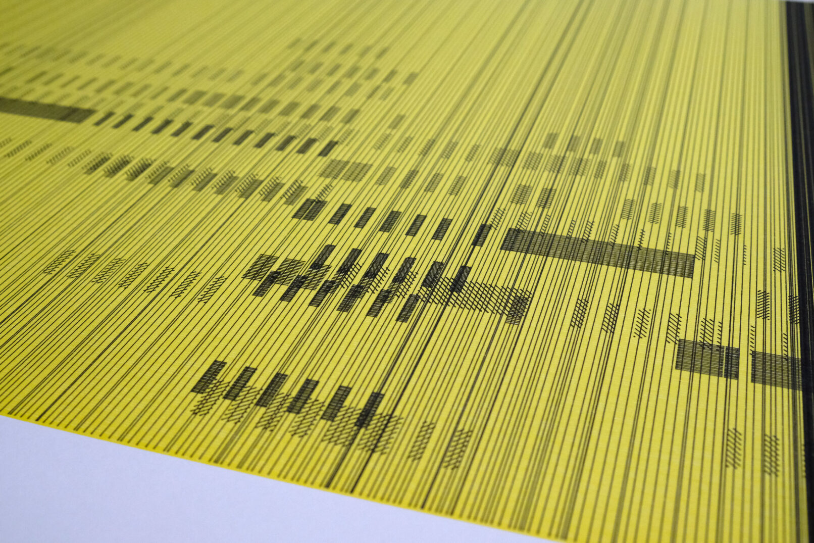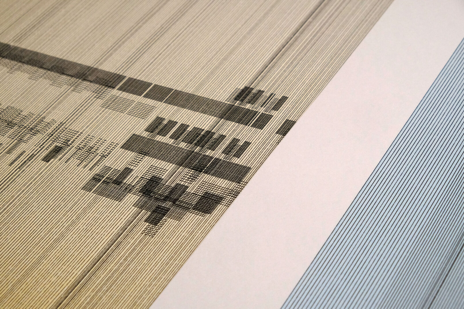 Frequency and loudness values of each song were extracted and transformed into vertical lines of different densities, overlayed by hatched blocks of different structures that represent the pitches.