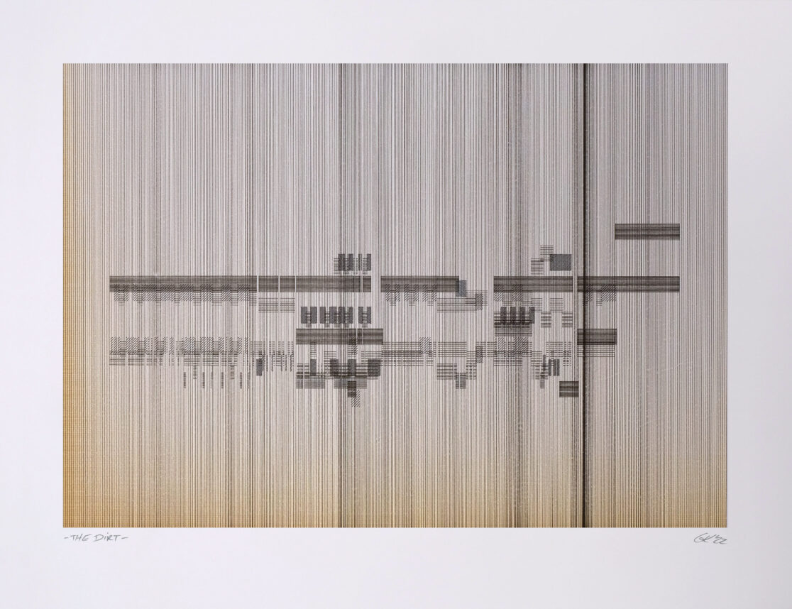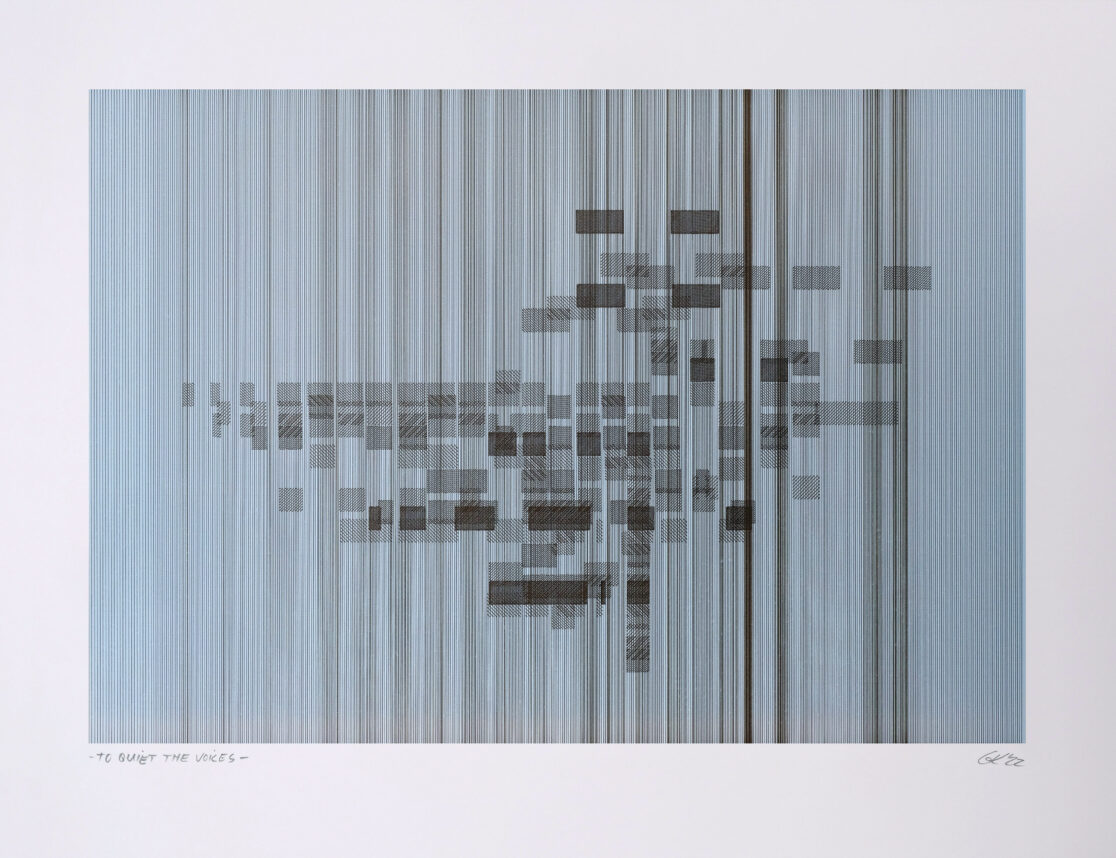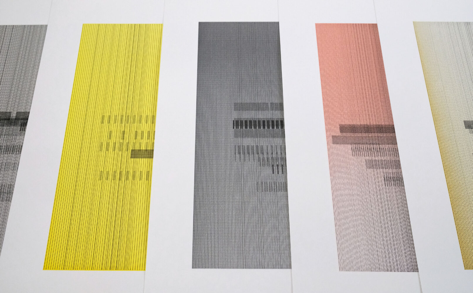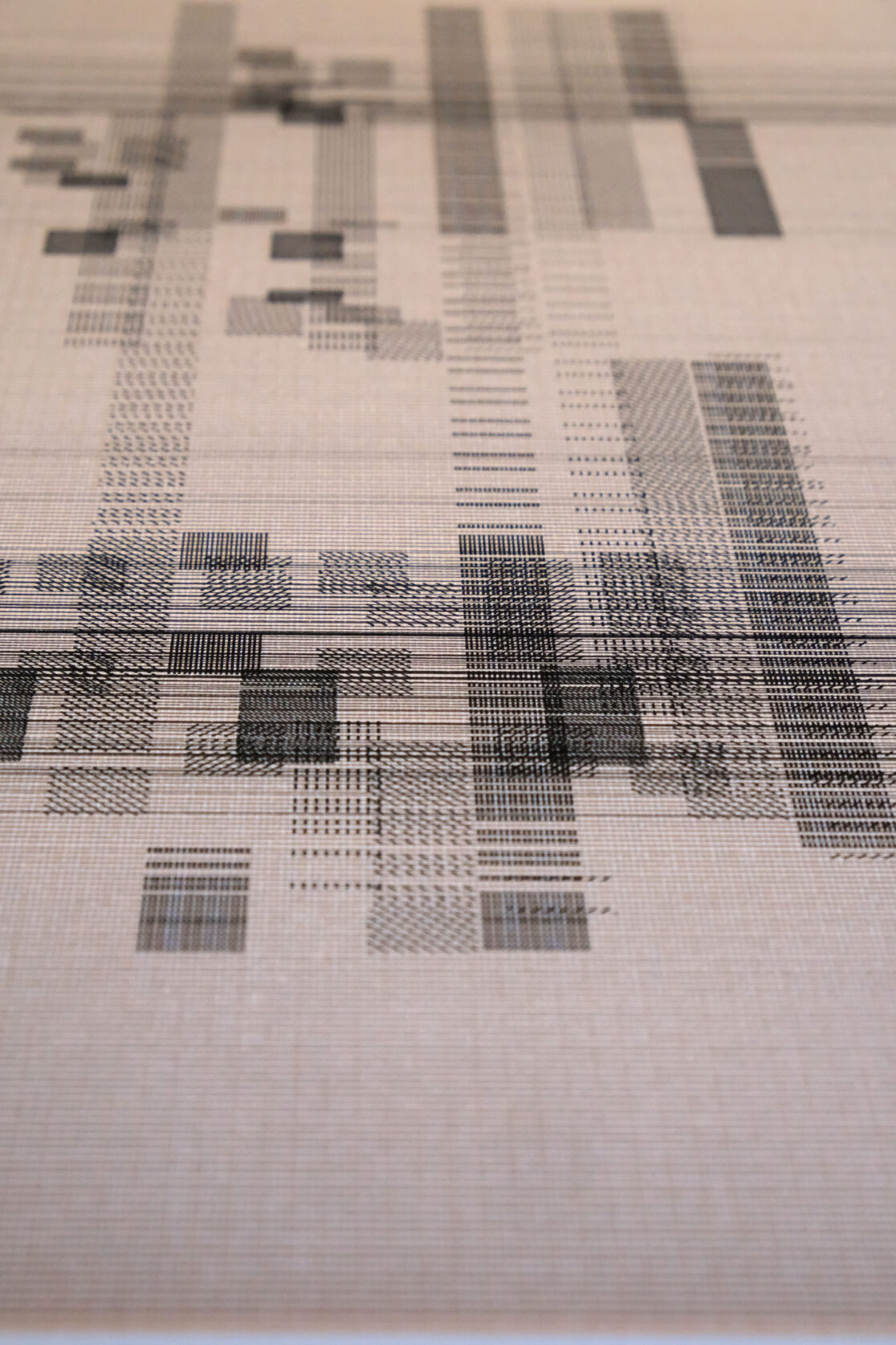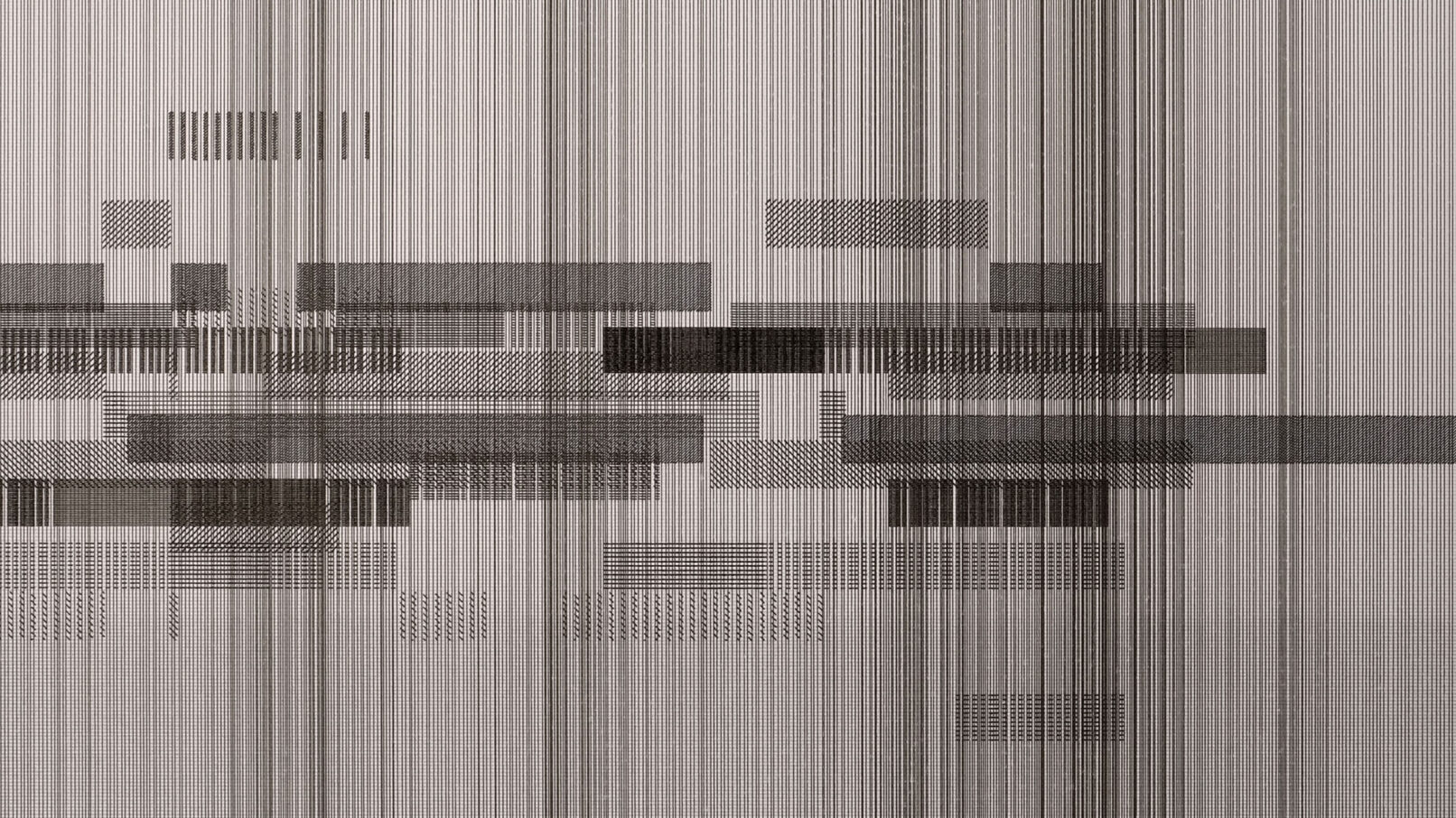Frequency and loudness values of each song were extracted and transformed into vertical lines of different densities, overlayed by hatched blocks of different structures that represent the pitches.