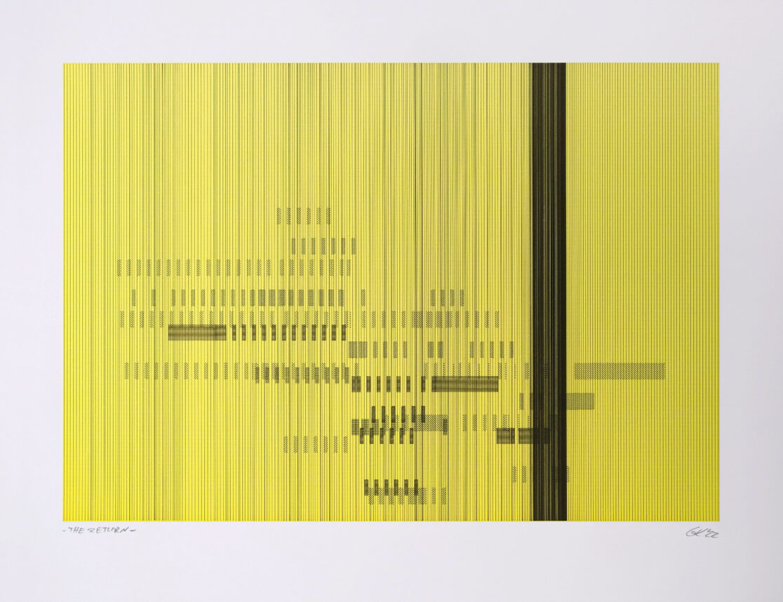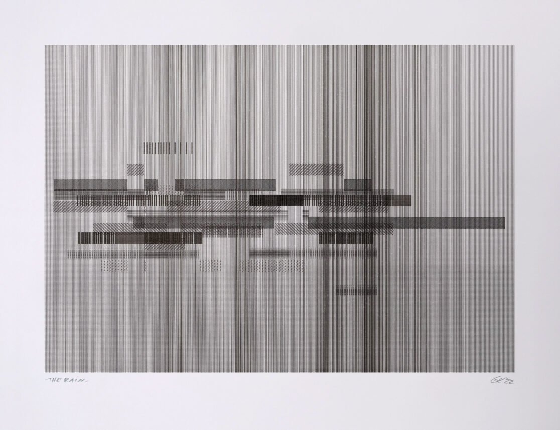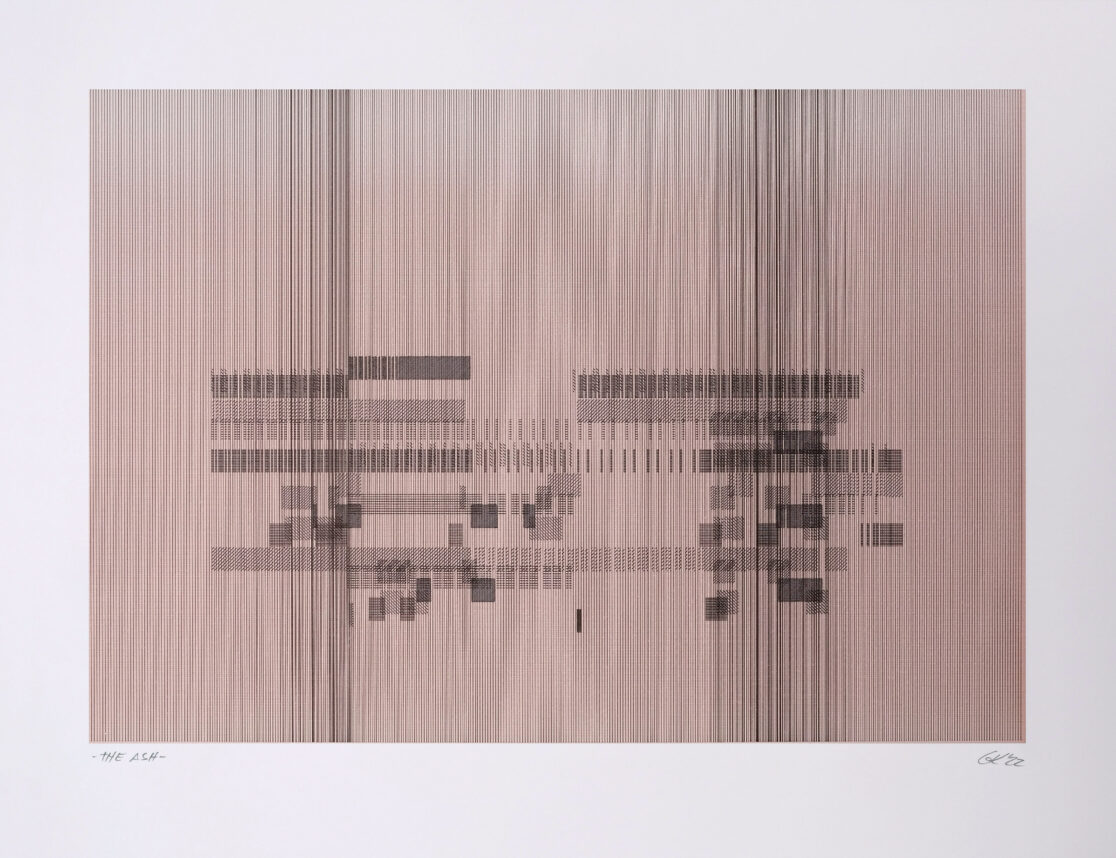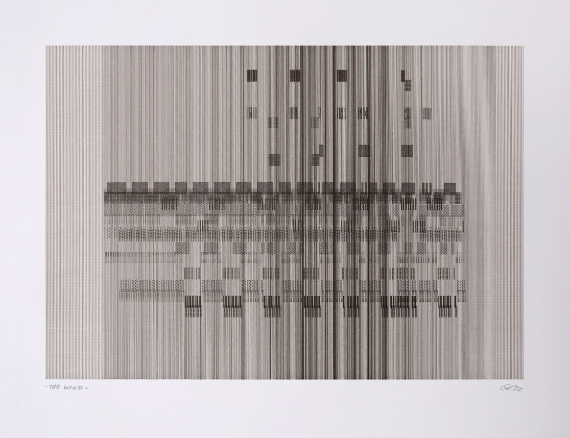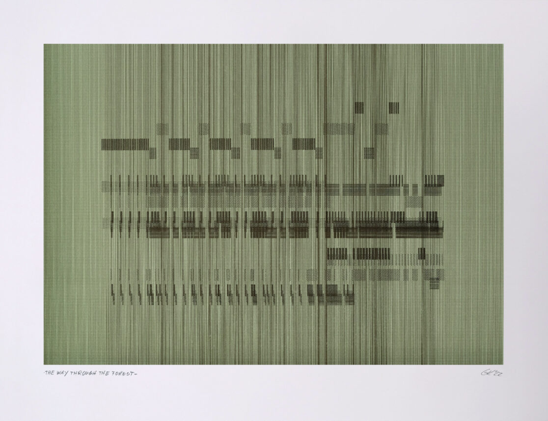 Frequency and loudness values of each song were extracted and transformed into vertical lines of different densities, overlayed by hatched blocks of different structures that represent the pitches.